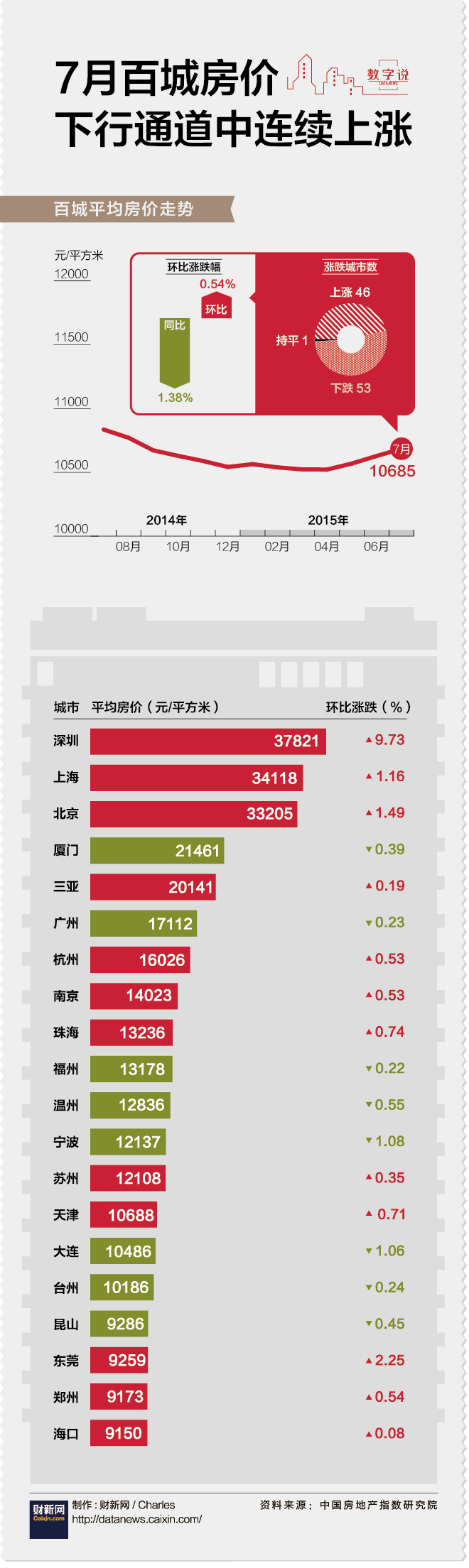 중국지수연구원(中国指数研究院)에 따르면, 2015년 7월 100개 도시 신규건설 주택가격은 평방미터당 평균 10,685위안으로서 전월대비 기준으로 3개월 연속 상승하였는데, 7월 상승률은 6월에 비해 0.02% 포인트 떨어진 0.54%였다. 동기대비 기준으로 100개 도시 주택가격은 여전히 하락 추세에 있지만, 전월대비 기준 반등에 힘입어 동기대비 하락폭이 지난달보다 1.32% 포인트 줄어든 1.38%로 집계되었다.