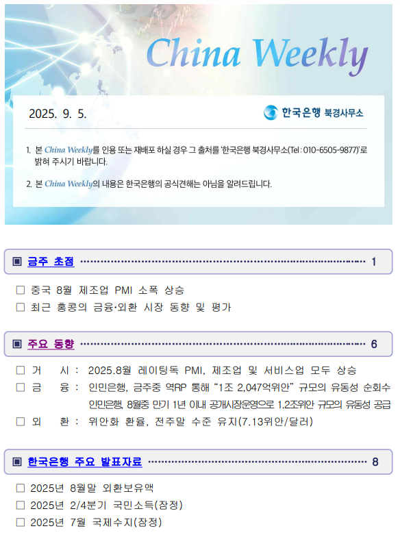 [한국은행 북경사무소] China_Weekly(2025-9-5)