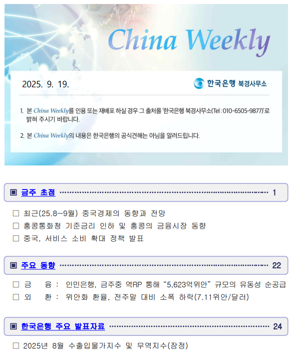 [한국은행 북경사무소] China_Weekly(2025-9-19)